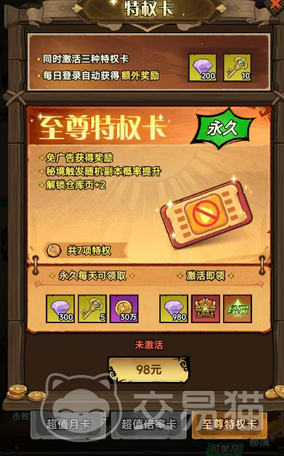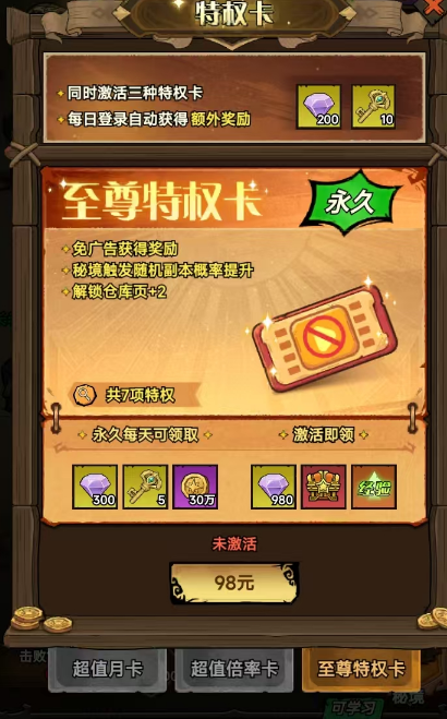 对于追求极致体验的深度玩家,98元至尊特权卡提供了更全面的优化支持。其核心优势包括:免除所有广告领取环节,节省重复操作时间;秘境中随机副本触发概率提升,提高稀有掉落获取几率;每日固定发放300钻石与5把钥匙。若预算允许,该卡能显著降低日常运营压力,提升整体流畅度与满足感。此外,三类特权卡(30元月卡、68元倍率卡、98元至尊卡)支持叠加生效,同时激活可额外获得每日200钻石与10把钥匙,形成可持续的资源增益循环。