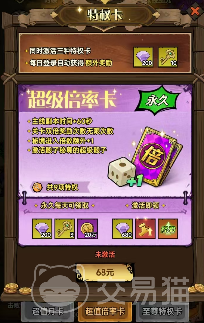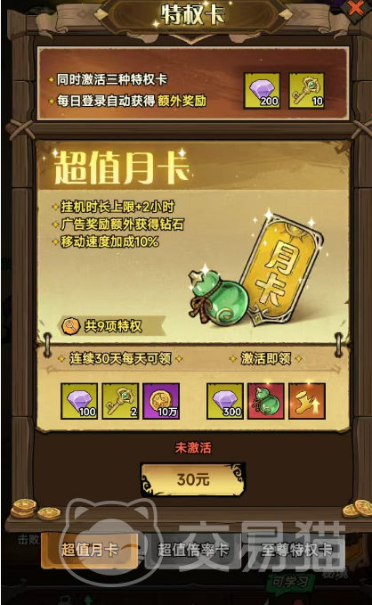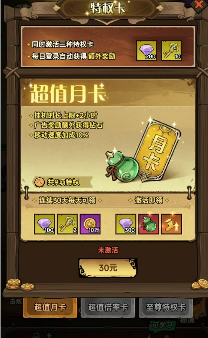 针对时间碎片化明显的用户群体,30元月卡具备较强实用性。开通后,挂机时长上限提升至两小时,离线收益同步增加,适合学生与上班族长期稳定积累资源。同时,广告奖励额外提供钻石,变相降低资源获取门槛;移动速度提升10%,加快地图探索与副本进出节奏;每日还可固定领取100钻石与2把钥匙。按30天周期计算,仅钻石一项即可覆盖成本。而68元的倍率卡为永久生效道具,支持无限次关卡双倍奖励,适用于材料与装备刷取场景,实现单次挑战等效两次产出,长期使用价值稳定。