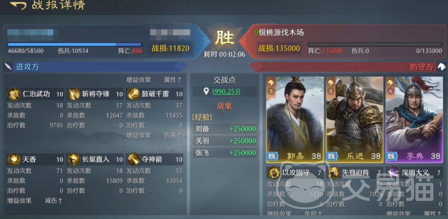 在阵容构筑层面,“桃园枪”是验证刘备战略价值的经典范式:由关羽、张飞与刘备组成三人核心。该组合通过叠加三层【重伤】状态压制敌方回复与防御成长,同时激活【桃园结义】缘分,额外提供全队减伤效果。三者技能链路高度互补——关羽提供控制与破甲,张飞承担前排承伤,刘备则以跨队治疗、多段减伤及长效增伤完成体系闭环,实现从单队到全局的战术辐射。