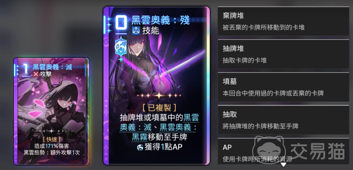 命座方面,低命座即可改善控牌顺序,提升操作容错;高命座则应聚焦“被动黑云”效果,以强化卡组整体一致性。“残”卡为复制优先级首位(仅移动单张卡,但触发稳定),其次为“屁股斩”“灭”及“拔刀”。整套体系的核心价值在于构建“神闪”触发生态——所有组件均服务于该机制的高频复现,从而形成可持续的0费运转闭环。