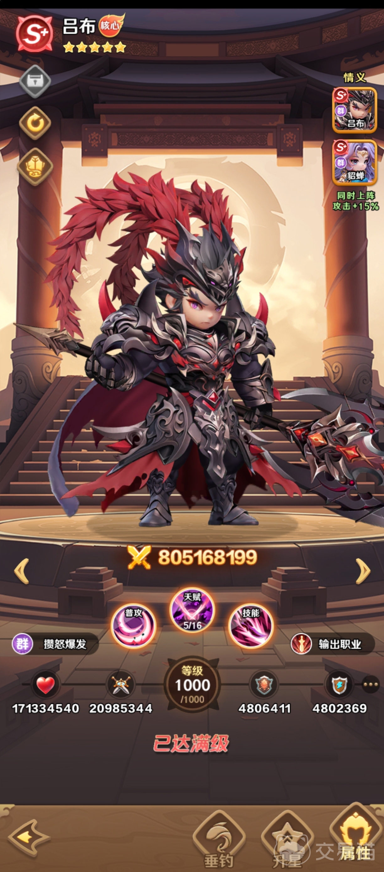 吕布属于大后期群体爆发型核心输出。其怒气积累效率随等级与装备提升后,在战斗中段即可快速进入满怒状态,主动技能可对全体敌人造成高额AOE伤害。该角色高度依赖怒气续航体系,推荐搭配具备怒气回复能力的辅助武将,如曹操或诸葛亮,以保障技能循环稳定性。在副本攻坚、阵营战及竞技场多目标场景中,吕布的清场效率与团战压制力均处于当前版本第一梯队。