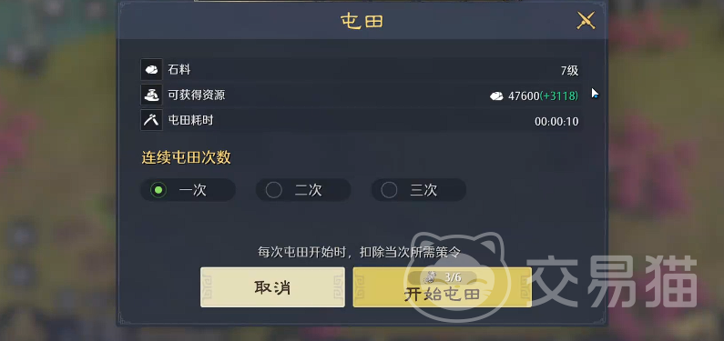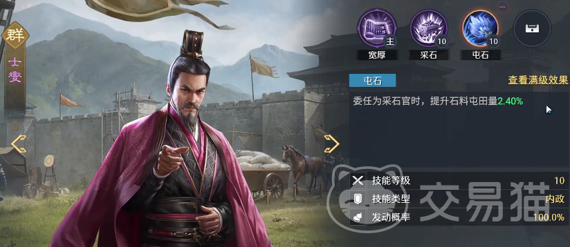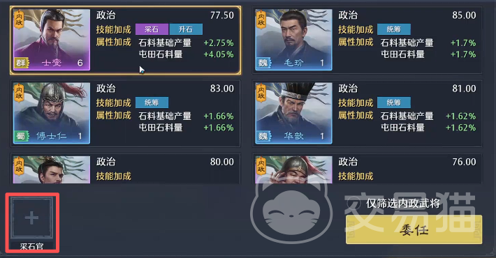 提升石料产量的关键在于内政系统中的“采石官”配置。当玩家将采石官的政治属性技能全部点满后,单次屯田基础产量可从1928跃升至超3000,增幅稳定在1000以上。实操建议:在每次开启屯田前临时激活该内政加成,待资源到账后立即撤回技能投入,从而实现资源投入零损耗、产出效益最大化。此操作可使每轮屯田周期延长4–5天有效产出时间。