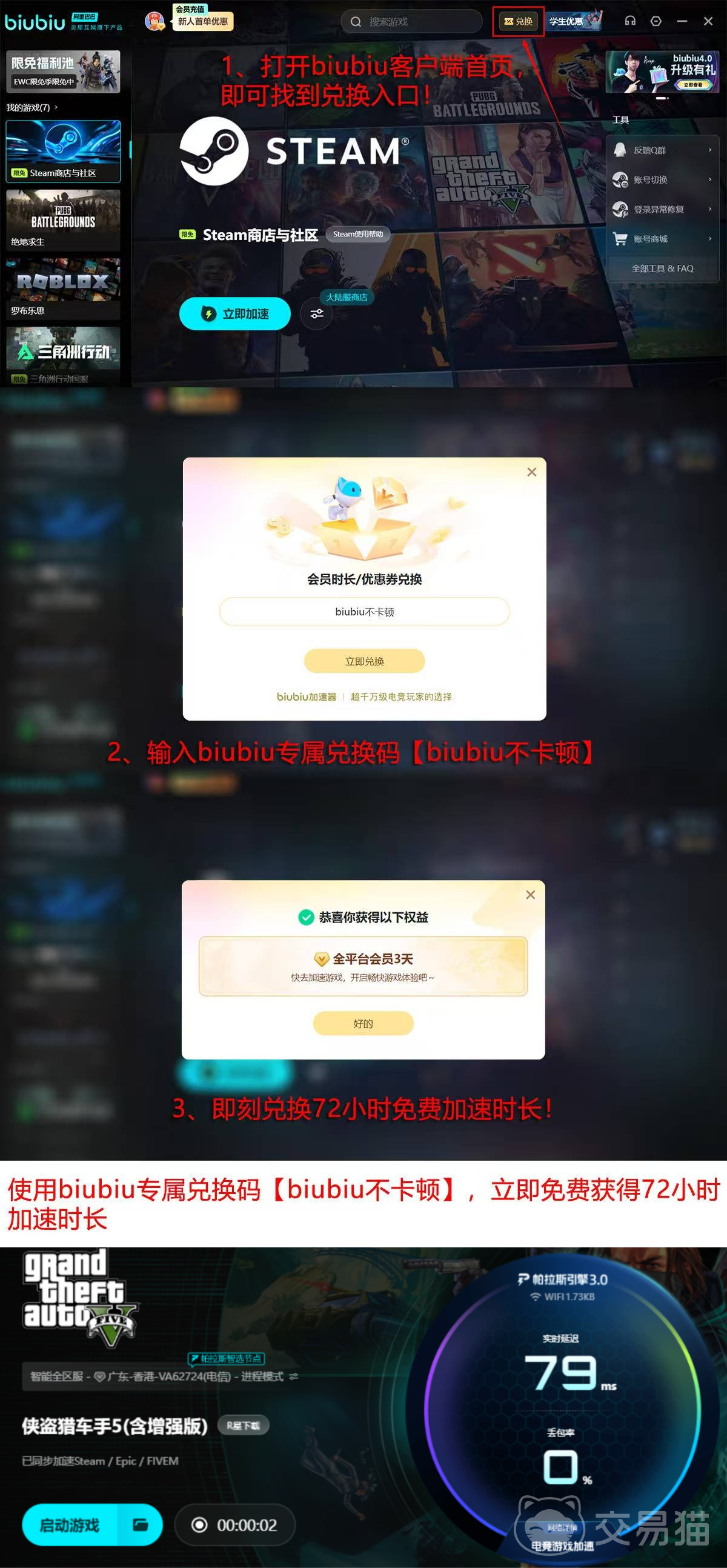 当前版本加速体验全面强化。新用户注册后即可获赠24小时免费高级加速服务;输入专属口令【biubiu不卡顿】,还可额外领取72小时顶级保障时长,两项权益叠加后,总计可享96小时无限制加速体验。