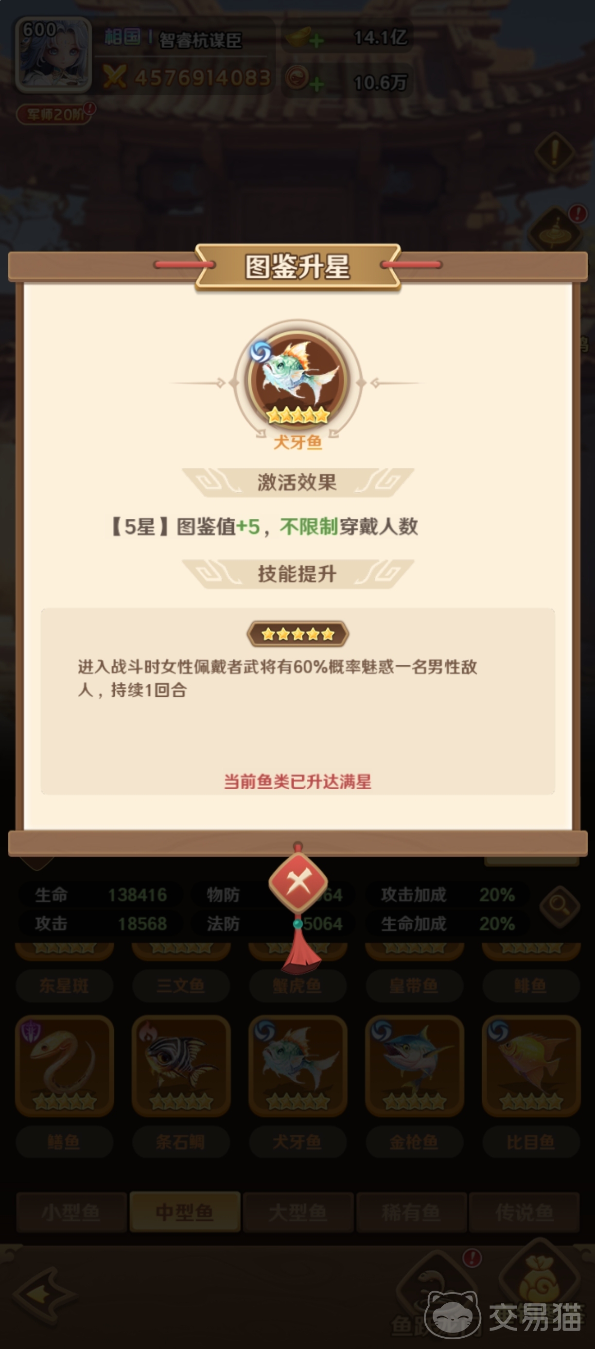 首选推荐犬牙鱼——该鱼种激活后即赋予图鉴值+5加成,且无佩戴人数限制。貂蝉装配后,其核心技能“倾城魅影”的命中率与控制时长获得实质性提升,使敌方关键单位更易陷入长时间失能状态,从而主导战局节奏转换。