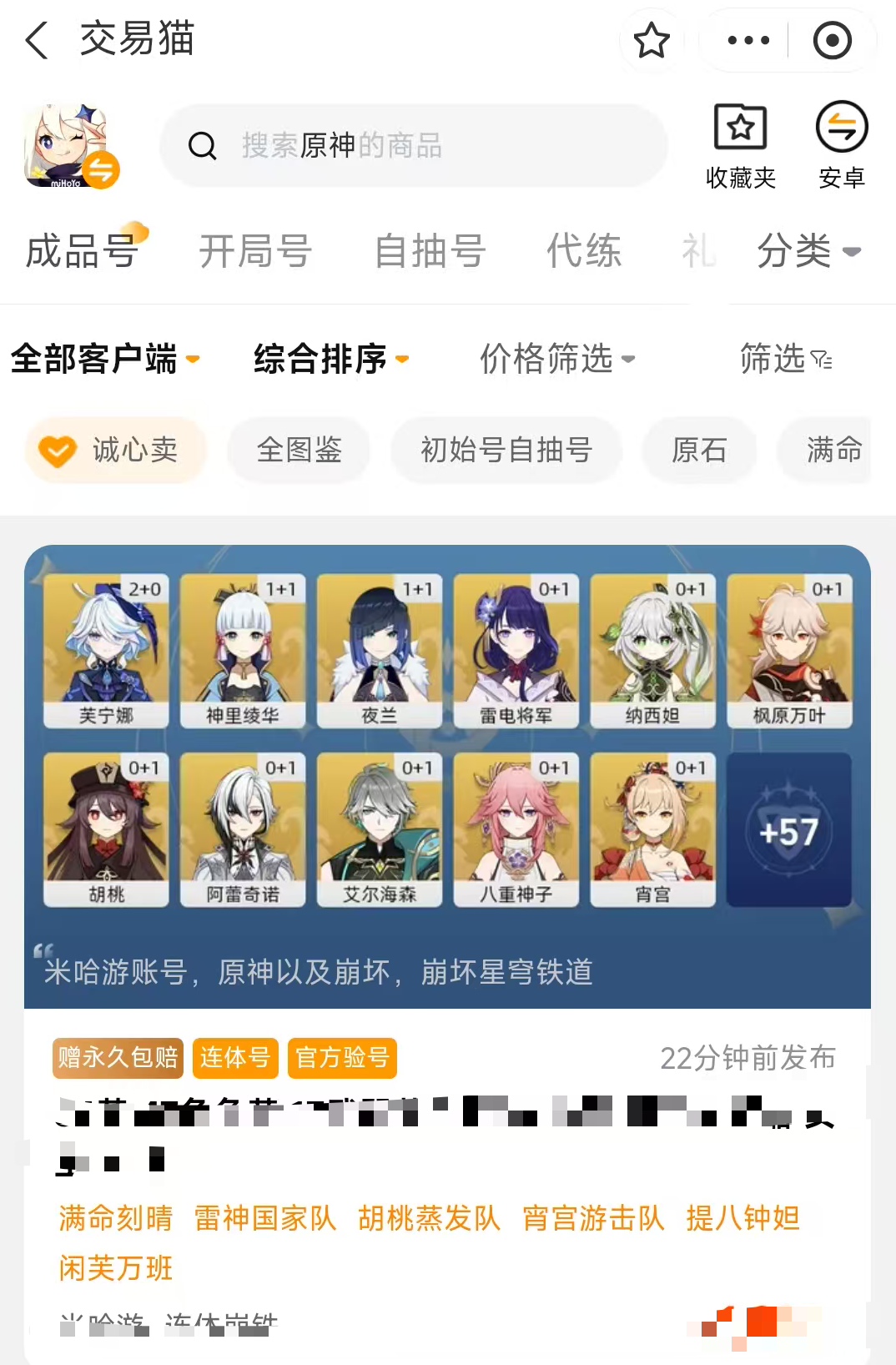 交易猫平台对于账号交易的流程是很全面的,因为平台内的多数账号都经过了官方的验号,验号以后会将账号里面的核心内容全部展现出来,这样玩家们就可以确定账号的信息,来决定是否继续购买,而且这类验号的账号还会附加安心购的服务,这个服务器的权益就是玩家们账号出现特殊情况下的话,平台会进行全额的赔付,这样玩家们购买账号的时候不需要担心安全的问题了,而且交易过程中都有专业的客服上号进行检测哦,而想要下载的话,安卓用户下载点击上文链接,iOS用户去搜索进入官网使用。