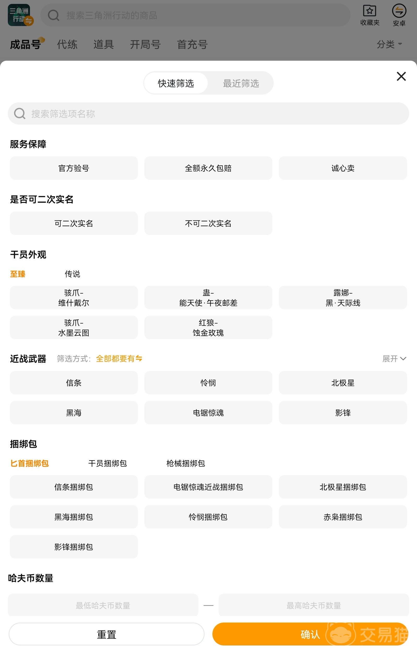 交易猫平台集中了海量的账号资源,不仅有样样齐全的成品大神号,还有适合当小号用的开局号。为了便于用户去查找符合你要求的账号,官方还在软件内加入了筛选功能,其中提供了多个选项,用户按照自己的需求完成选择后,只需一键就能找到一批心仪的账号。