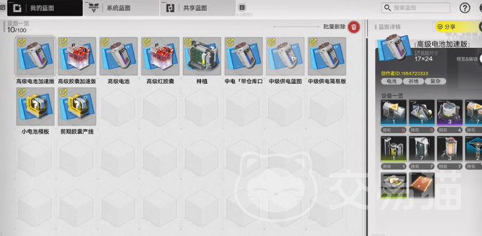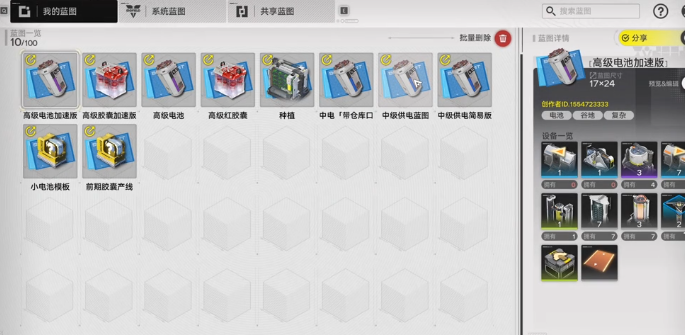 该胶囊产线具备原料切换弹性:前期以紫晶矿为输入,产出标准型胶囊;待蓝铁矿解锁后,仅需更换原料即可升级为高价值胶囊,全程无需重建产线,大幅节省营地空间。电池类产线则需按等级分层规划:小型电池可直接调用系统预设蓝图;中型与大型电池则对应更高供电需求,尤其在中后期营地用电负荷激增阶段,必须提前部署高级电池产线。若空间受限,可选用简易版蓝图——虽减少两组原石矿模块,但单位产能提升约1.5倍,性价比突出。