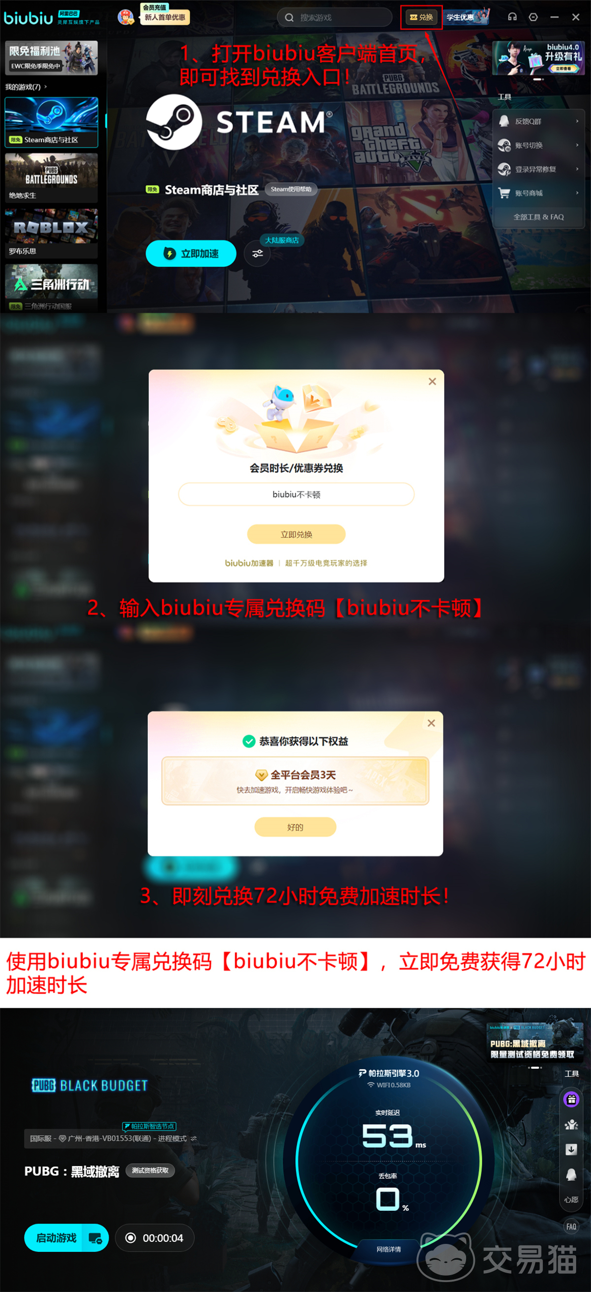 关于加速服务时效,新用户完成biubiu账号注册后,可即时领取24小时免费加速时长。使用完毕后,输入通用兑换码“biubiu不卡顿”,即可额外激活72小时加速权益。该兑换码适用于全部账号,不限新老用户,每位账号限用一次。