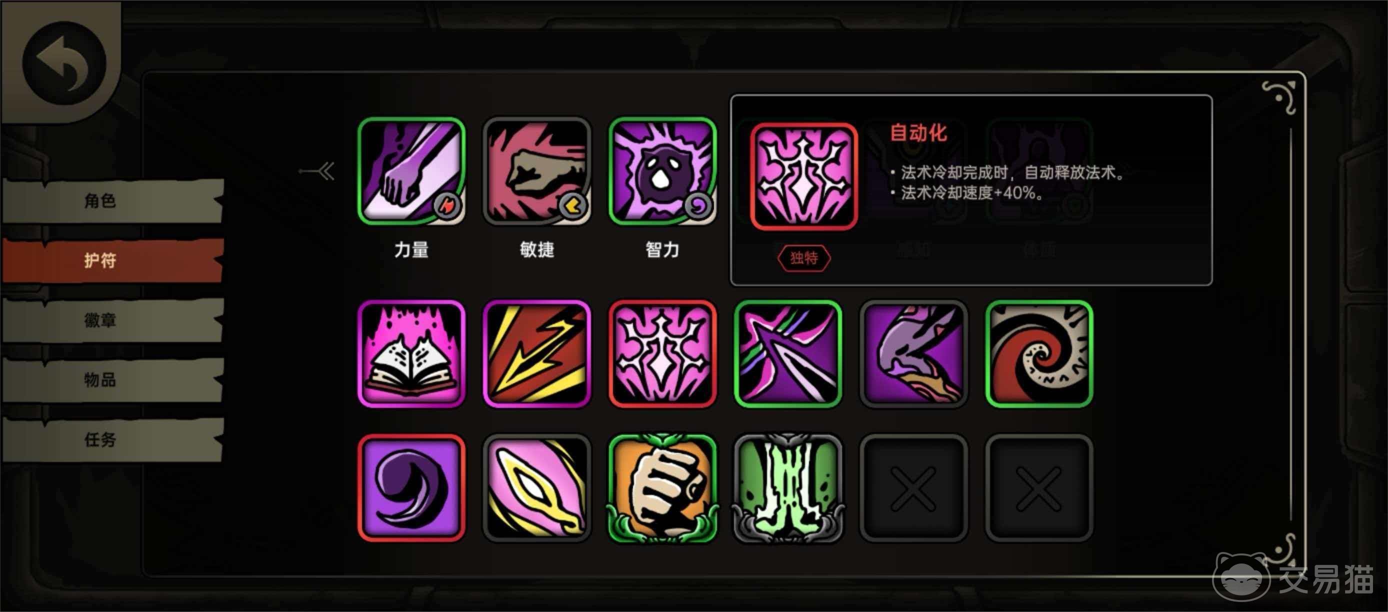 “自动化”护符提供独特的自动施法能力,解放操作负担;其核心增益为所有BUFF类法术冷却缩减40%,大幅提升技能循环频率,使毒素叠加节奏加快,持续伤害积累速度成倍提升,是构建高效叠毒体系的关键组件。