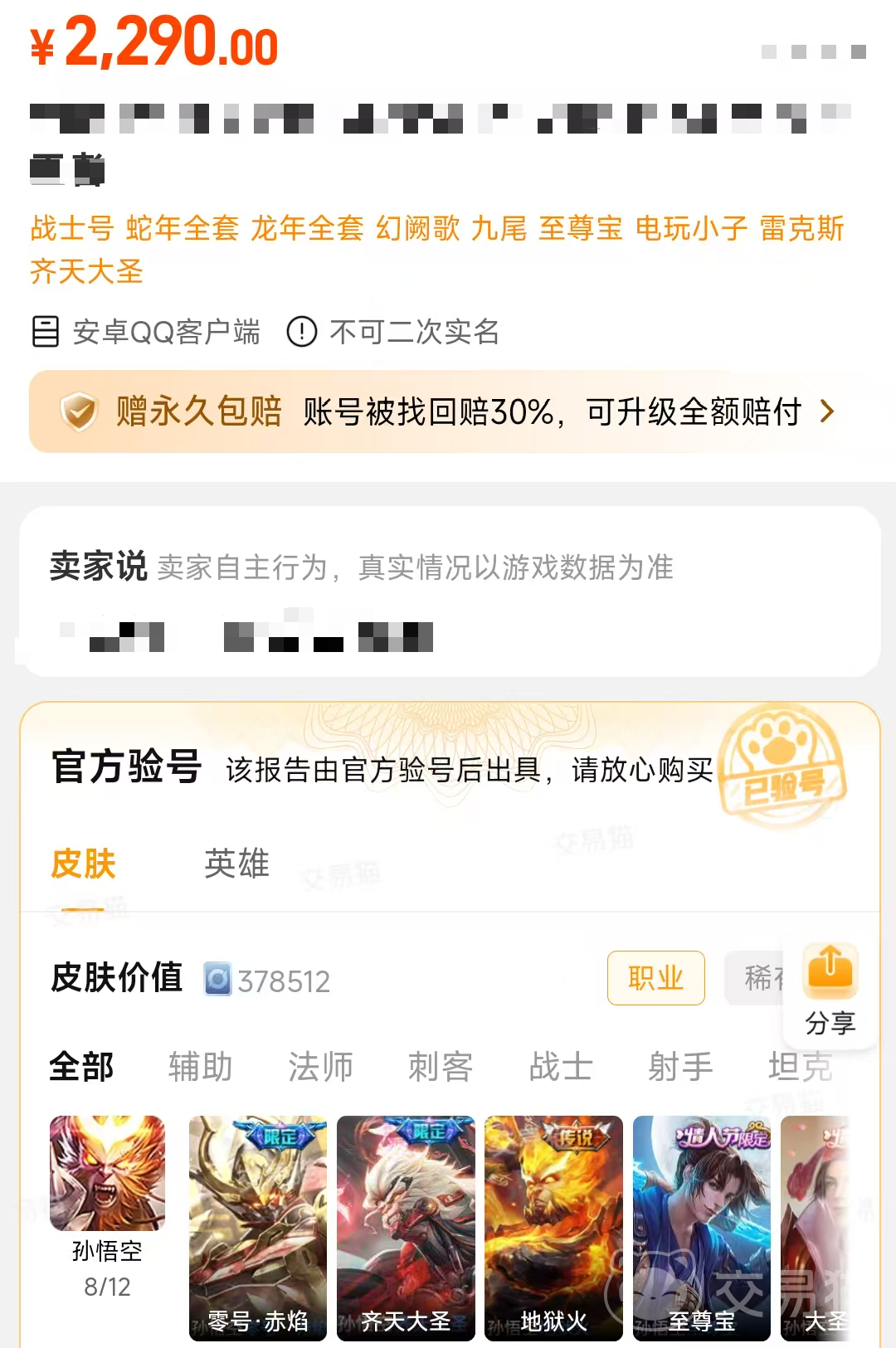 交易猫平台的王者荣耀账号的数量是非常多的,这使得玩家们很容易挑选出自己喜欢的账号,而且每个账号都经过了官方的验号流程,也就是在账号里面能完整地看见账号内的皮肤数量以及类型,这样玩家们在挑选的时候可以省区很多不必要的时间,同时这部分账号还会赠送安心购的服务,一旦账号出现意外或者丢失的情况,官方都会进行等比例的赔付,确保双方的权益可以得到保障,而想要下载的话,安卓用户下载点击上文链接,iOS用户去搜索进入官网使用。