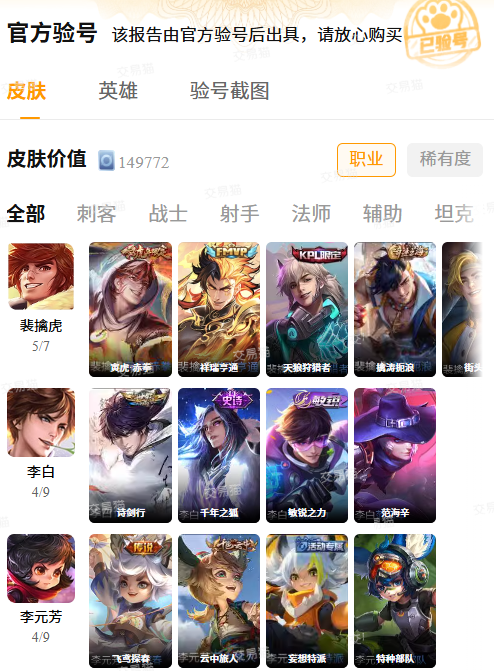不同玩家所需要的账号类型也不一样,在交易猫里就提供了各式各样的账号。例如可以提供大量抽卡道具的资源号,又或者含有某个极品皮肤的账号,又或者段位极高的账号。大家均可按照实际需求去选购自己想要的号,避免浪费过多的钱,从而实现对应的目的,让自己玩得更加开心!