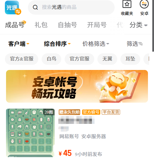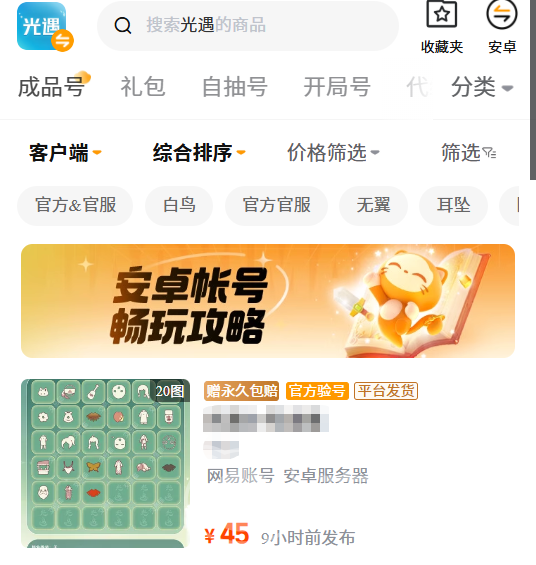毕竟光遇的渠道服更加小众,想买到的话最好认证大的平台。对于使用安卓设备的朋友来说,可通过上方按钮下载交易猫app,打开后即可物色自己所需要的渠道服号啦!要是使用的是IOS设备,即可直接打开交易猫官网,在线直接挑选,一样简单!另外在这买号,还有其他好处!