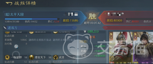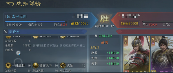 当赵云激活【一身是胆】技能后,进入全队输出峰值阶段:获得120点武力加成、统帅加成,并使后续所有攻击必定暴击,额外提升50%伤害。若为满红赵云,暴击伤害倍率由150%提升至200%;即便仅有一星至三星低红配置,该技能仍可支撑高强度压制输出。刘备除提供青州军反击支持外,其普攻还附带兵力恢复效果,增强阵容续航能力;关羽则承担团队辅助职能,提供全队80点武力加成及兵力回复,进一步强化整体生存与输出稳定性。