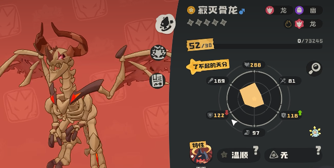 大头骨龙总种族值为587点,在当前版本龙系精灵中处于上游水平。其属性分配高度贴合物理输出定位:攻击与体力两项成长尤为扎实,配合较高的双防基础,使其在持续作战与爆发衔接之间具备良好容错空间。该数值虽未达到全图鉴顶尖区间,但已显著优于绝大多数常规主力精灵。