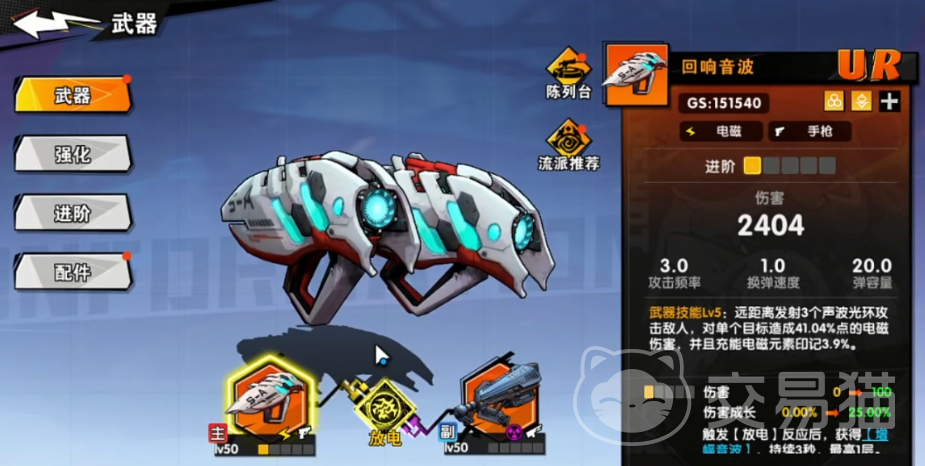 电磁系输出首选为手枪类武器【回想音波】,该装备与角色妮雅形成高契合度组合。其核心机制为远程三重声波环发射,单次命中造成相当于基础攻击41%的电磁伤害。充能过程中可叠加元素印记,提供3.9%充能效率加成;当武器升至一阶时,基础伤害值突破2000点。两项百分比增益在手枪品类中处于梯队前列,且支持最高五阶强化路径,成长潜力明确。