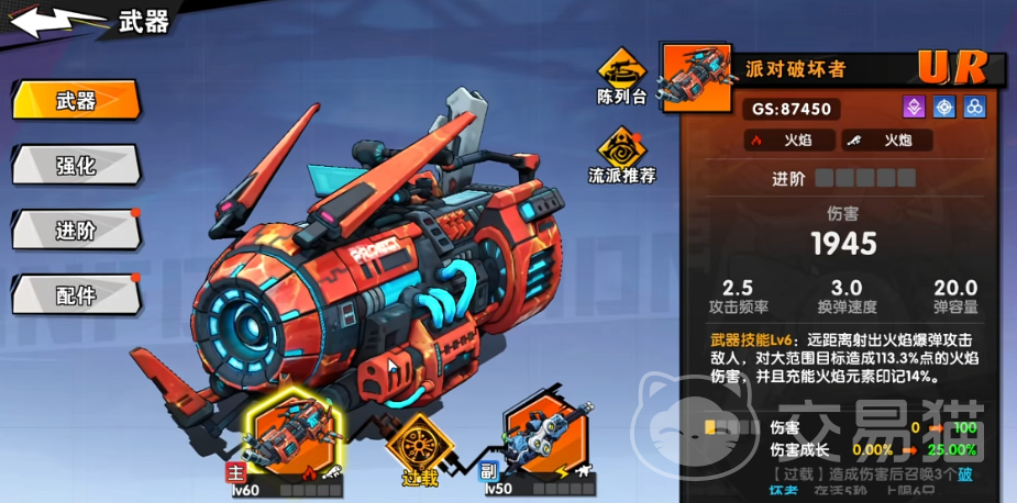 火焰属性角色推荐搭配火炮类武器【派对破坏者】。该武器初始基础伤害约1900点,虽起步数值中等,但具备显著的后期成长性,可通过主副武器协同加成持续提升输出阈值。实战中兼具远程打击与大范围AOE覆盖能力,单发火焰爆弹可造成113%基础攻击的火焰伤害;完成元素充能后,额外激活14%火焰印记增益,有效强化爆发阶段的元素连锁反应强度。