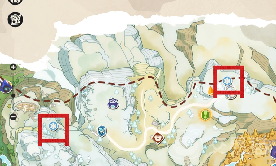 第一种方式为野外持续捕捉机制。玩家需先前往指定区域采集两株特殊果实——该位置已在下方地图中标注为红色方框区域。打开游戏大地图,定位对应坐标后步行抵达,即可完成采集。随后将果实投入眠枭巢穴,触发雪影娃娃的周期性刷新。需注意:刷新后的雪影娃娃初始均为常规形态,仅当累计捕捉次数达到阈值后,才有概率变异为粉色个体。为保障连续捕捉效率,建议避免使用传送功能;优先选择靠近锚点的庇护所作为补给据点,以加快体力恢复速度。此外,开启联机模式可提升单位时间内刷新数量,进一步提高获取效率。