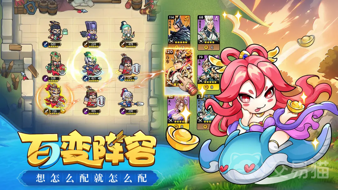玩家主要通过拖拽武将至棋盘指定位置完成布阵,后续战斗全程由系统自动推进。胜负关键高度依赖阵容构建逻辑——既要评估单个角色的技能特性与成长曲线,也要统筹兵种相克关系(如弓克骑、骑克步、步克弓),同时激活特定历史组合羁绊,例如“五虎上将”“四大都督”等阵营标签,可触发额外增益效果与专属视觉反馈。