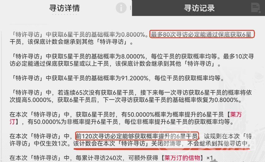 值得注意的是,在限定卡池中,当期UP干员仅占全部6星出率的50%。其余50%由其他6星干员均分。若在第80抽达成保底却未获得UP角色(即“歪”),则自该次起,后续累计至第120抽时必定获得当期UP干员。此项大保底计数不跨卡池延续,新卡池开启后重置。