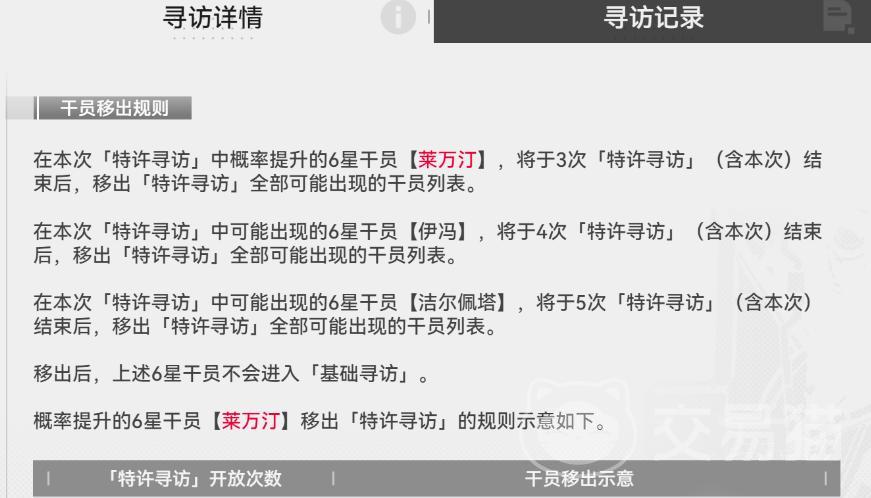 游戏内设有两类独立卡池:限定卡池与常驻卡池。限定卡池中,当期UP干员(如当前卡池的莱万汀)享有概率加成;该角色在下期将不再作为UP对象,但也不会转入常驻池。常驻卡池中,6星干员的基础抽取概率为0.8%,且第80次抽取必得至少一名6星干员。