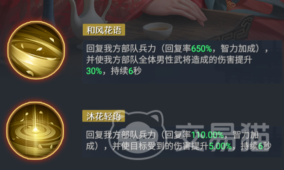 大乔拥有两个主动技能:“和风花语”可为全体己方部队恢复兵力,并使所有男性武将造成的伤害提升30%,持续6秒;“沐花轻语”同样具备兵力回复效果,但会附加小幅受伤提升负面状态,持续时间同为6秒。其中30%的群体增伤幅度,在前期资源有限阶段尤为关键,能大幅缩短战斗时长,提升推图与资源掠夺效率。