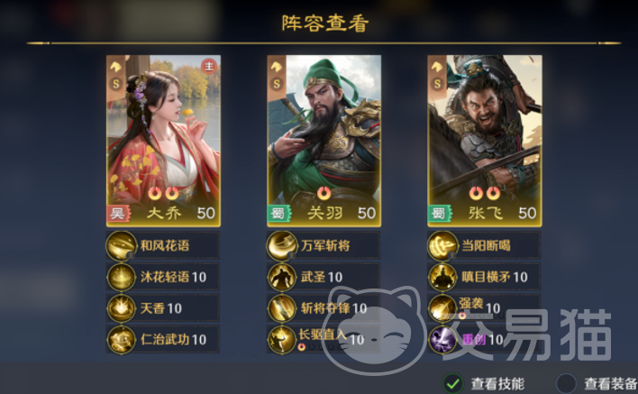 除上述经典组合外,大乔亦具备极强的阵容适配性。例如在缺乏刘备的情况下,可将其作为桃园体系中的功能替代者,与关羽、张飞组成新形态“类桃园”队伍。得益于其骑兵与枪兵双S兵种资质,大乔能与关、张完美契合,顺利激活3S兵种加成,兼顾生存与输出支援能力。