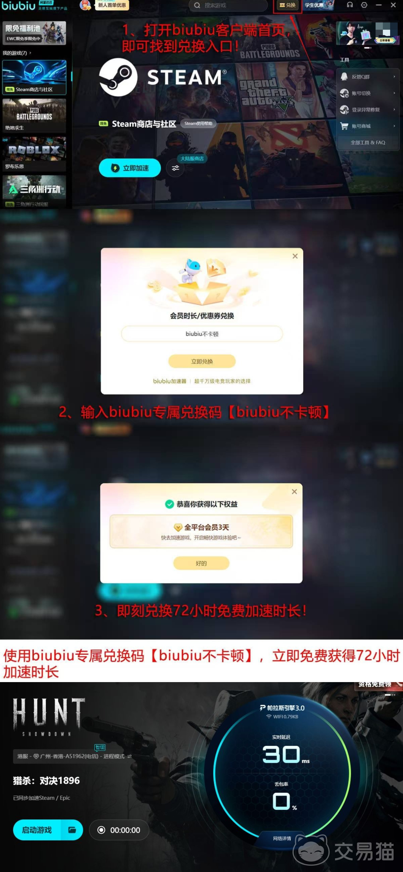 新用户注册后可直接获得24小时全功能试用权限;所有用户还可额外领取3天加速时长,需在活动页面内通过指定入口完成【biubiu不卡顿】口令兑换,限时有效。
