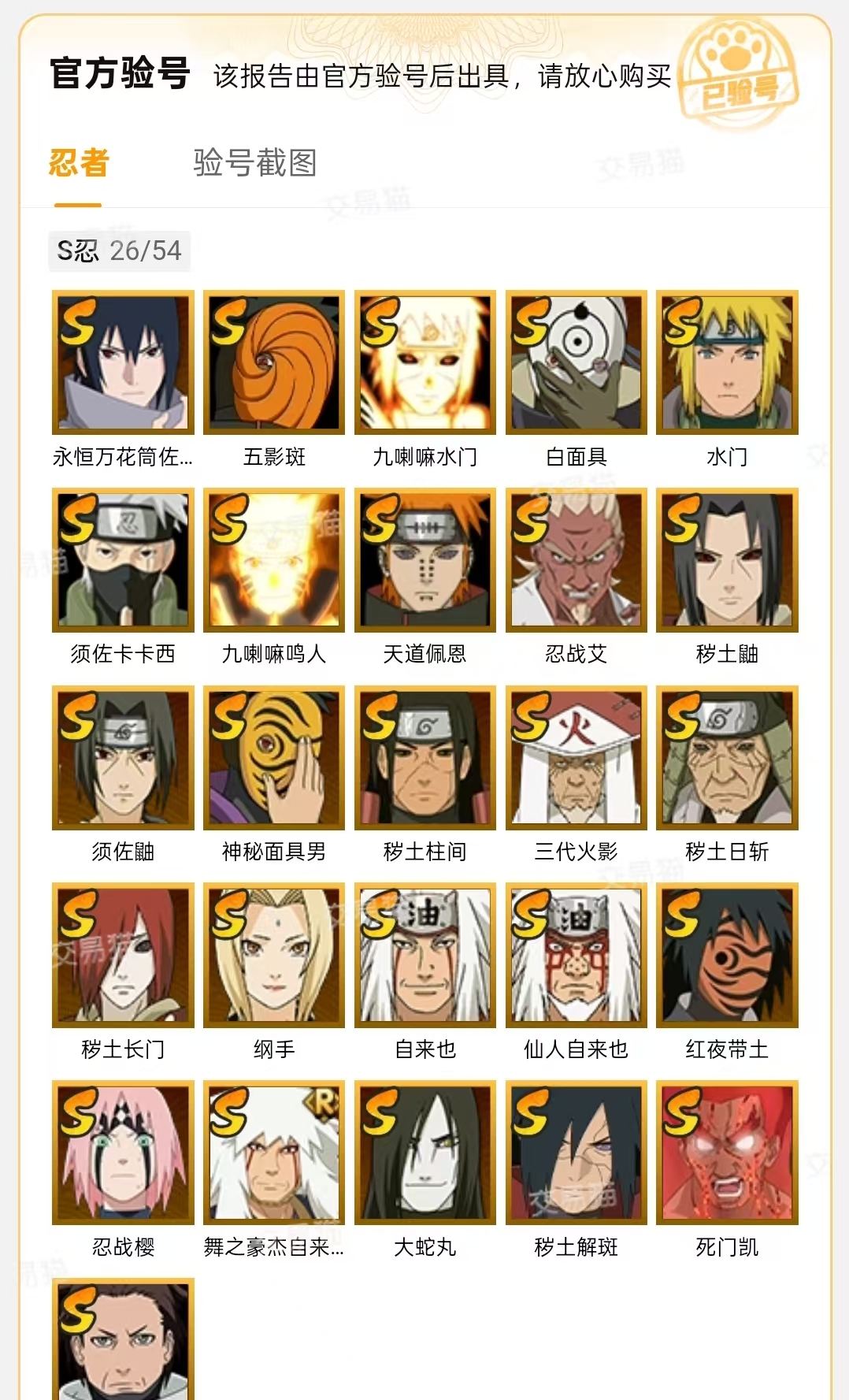 大家都会好奇,交易猫为何拥有这么多的用户,单就拿火影忍者手游来说,软件内挂售的绝大部分游戏账号都是经过官方验号的且出具验号报告的,这样一来方便玩家选择心仪的账号,二来保证了账号价值的真实性,在这里选购账号就不怕上当受骗了。