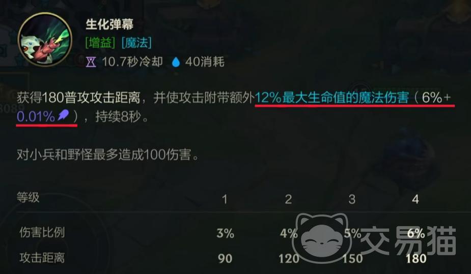 二技能“生化弹幕”是克格莫的核心输出增幅手段,开启后显著延长普攻射程,并使每次攻击附带基于目标最大生命值的额外魔法伤害。此技能不仅强化清线与消耗能力,更是团战中风筝敌方前排的关键保障,但需注意其存在冷却空档期,期间单挑强度明显下降。