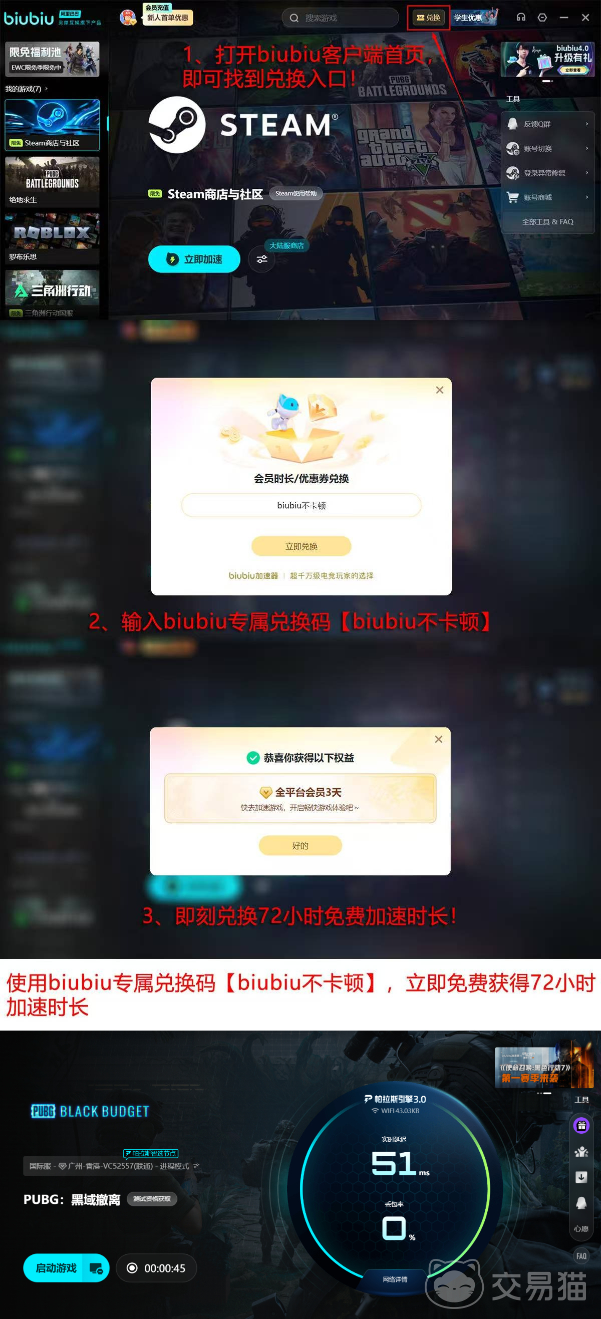 当前,用户登录biubiu平台可参与每日加速任务,完成即获抽奖资格,奖池涵盖限量测试资格及免加速时长卡。新用户注册即赠24小时无延迟体验;在客户端输入专属口令【biubiu不卡顿】,还可额外兑换72小时电竞级加速服务。注册叠加口令,总计可享96小时高品质网络支持。