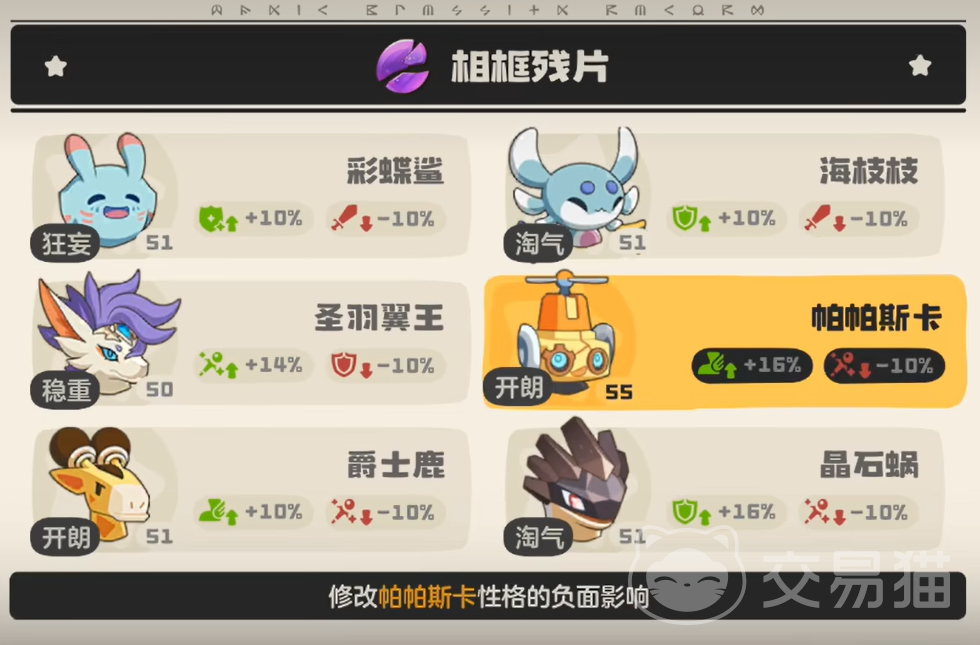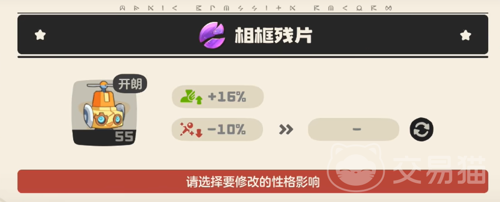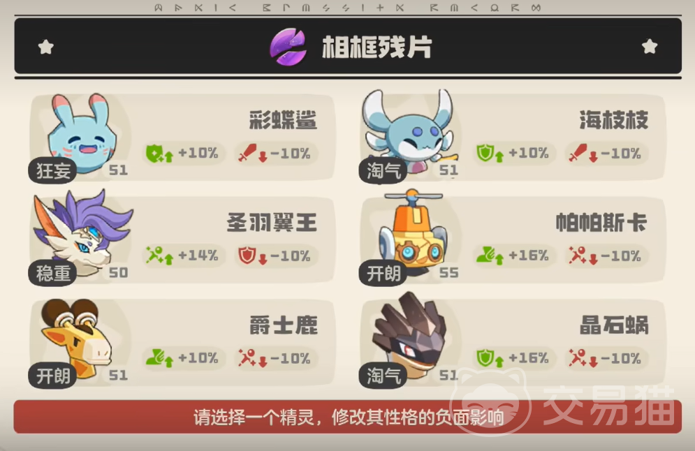 核心道具名为“相框残片”,专用于性格微调。该道具仅能变更性格中的“减益项”,无法更改已固定的“增益项”。举例说明:若目标精灵初始性格为“胆小”(+速度,−物攻),使用相框残片后可将“−物攻”替换为“−魔攻”或“−防御”等其他减益属性,但“+速度”这一加成始终不可变动。因此,若需达成“固执”(+物攻,−魔攻)效果,必须先获得具备“+物攻”加成的性格个体,再通过相框残片将减益部分调整至魔攻属性。