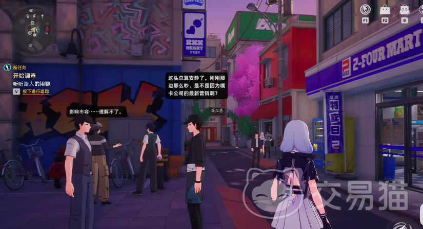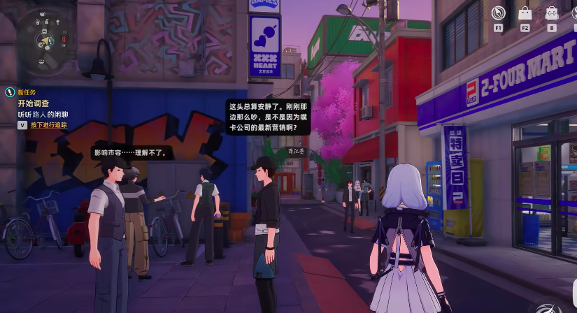 任务起始于街角黑胶唱片售卖处——玩家需主动与NPC西德对话并接取委托。离开店铺后,留意右侧毗邻的“2—FOUR MART”便利店,在其周边区域存在多位可交互NPC;其中一位头戴帽子的角色为关键触发点,与其交谈即可解锁首个线索地点:噗卡糖果屋。启用游戏内追踪功能,系统将自动规划行进路线。