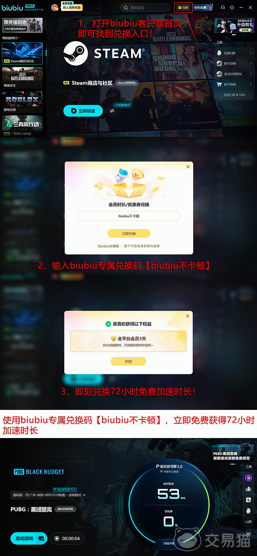 针对新注册用户,biubiu提供24小时无门槛免费加速服务。所有用户(含新老)输入兑换码“biubiu不卡顿”,均可额外领取3天全功能使用权。