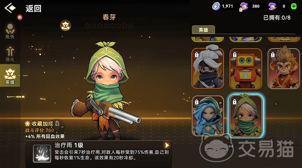 装备强化采用格子绑定机制:所有强化等级永久归属角色对应装备槽位,更换武器/防具无需重复培养。初始英雄无主动技能,需通过游戏内获取或购买解锁。推荐优先使用签到第七日赠送的“春芽”角色——虽为免费获取,但综合性能优于初始默认角色,适配度高,适合新手过渡使用。