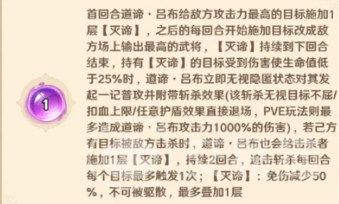 魂5进一步压缩斩杀阈值:每叠满2层【集谛】效果,斩杀线提升5%,满层(10层)时可对生命值高于50%的目标执行斩杀;成功斩杀后,还可令被该目标此前击杀的所有我方武将原地复活,极大缓解逆风局兵力劣势;魂7提升对残血目标的伤害效率,每层【集谛】增加10%效果抵抗,达4层后普攻附带溅射,8层即直接激活【涅槃】状态;魂10专为PVP优化:凡被道谛吕布击杀的敌方武将不可复活;若目标身负5层【苦果】效果,则判定为永久死亡,任何形式的复活手段均无效。