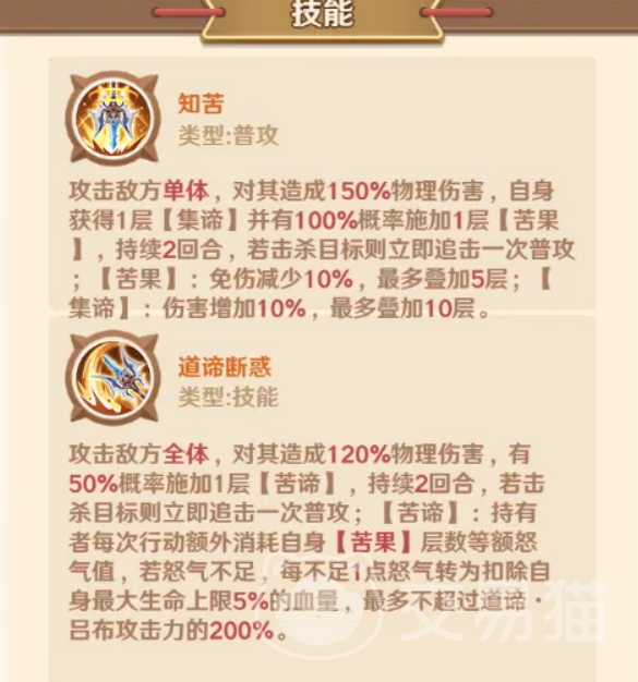 基础技能方面,普攻【知苦】具备成长性:命中后为自身叠加伤害增益,同时为目标施加减伤debuff;若击杀目标,则触发追击效果,有效延长输出链。主动技能【道谛断惑】为全体范围攻击,并附加【苦谛】状态——该效果使敌方每次行动均消耗怒气,怒气不足时转为真实伤害扣除生命值,直接动摇对手技能释放节奏,是PVP中极具威胁的软控制手段。