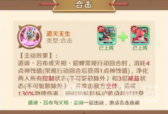 与灭相貂蝉的合击机制同样具备战术价值:当神蚀值充满后,可主动释放合击技,清除自身控制与减益状态并附加高额伤害;被动层面则持续为道谛吕布提供伤害加成,双将同场时整体输出效率明显提升,虽非质变增幅,但协同收益稳定可观,推荐组合出战。