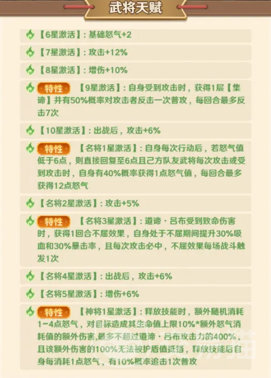 天赋系统分层明确:9星激活反击机制并提升伤害;名将1星赋予稳定怒气回复能力——行动后若怒气低于6点则自动补至6点,且队友受击或造成伤害时均可额外获得怒气,上限12点,保障技能释放频率;名将3星提供单次触发的【不屈】效果,濒死时大幅提升吸血率、暴击率与命中率;神将1星引入怒气消耗型真实伤害——释放技能时额外消耗1–4点怒气,造成无视护盾的真实伤害,每消耗1点怒气还有概率追加一次普攻。