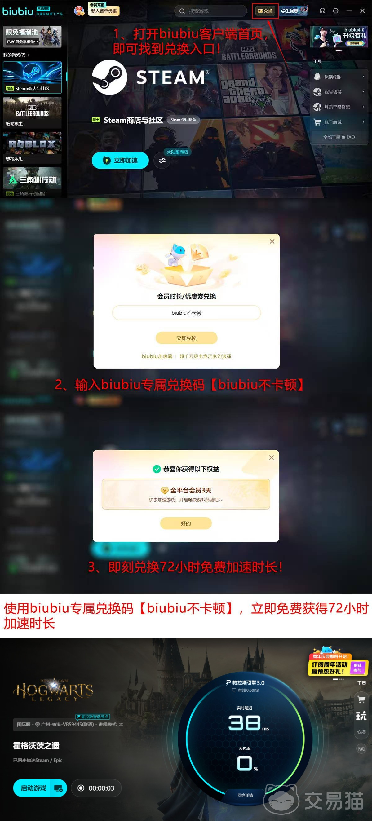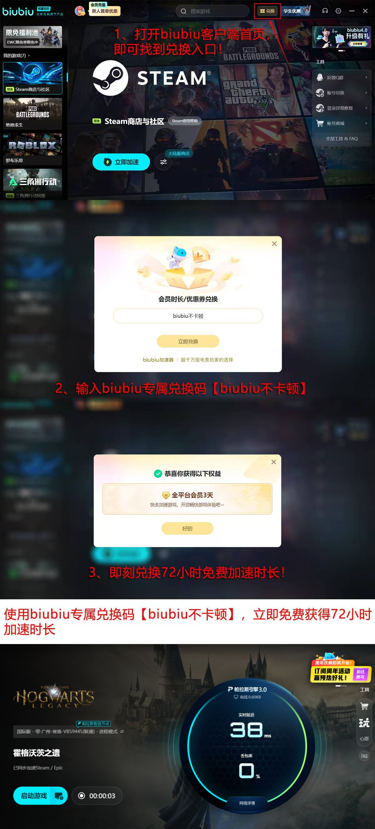现阶段正值新用户权益集中释放期。首次注册并完成身份验证的用户,可立即激活全平台通用的24小时无限制加速权限。登录客户端后,输入指定激活码“biubiu不卡顿”,还可额外解锁连续72小时加速服务。两项叠加后,新用户总计可享96小时高效网络支持,覆盖从游戏领取、下载到初期体验的完整周期。