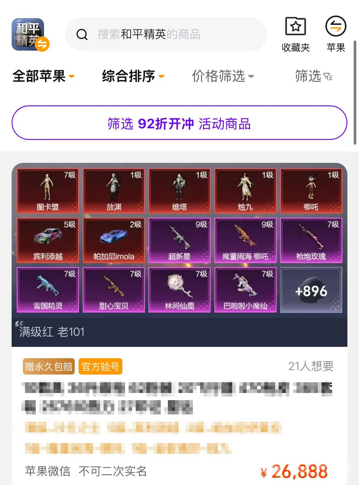 平台里的和平精英游戏账号不仅种类繁多,价格也任君挑选。为了方便用户搜索,交易猫专门设置了和平精英交易专区,买家可以根据自己的需求来选择价格区间,系统会自动推荐符合要求的优质账号。现在还有92折开冲活动,筛选参加活动的商品,在里面挑选一个自己喜欢的,从此感受当大佬的快乐,新号一进入游戏就吸引其他玩家的眼球,实在是太拉风了。