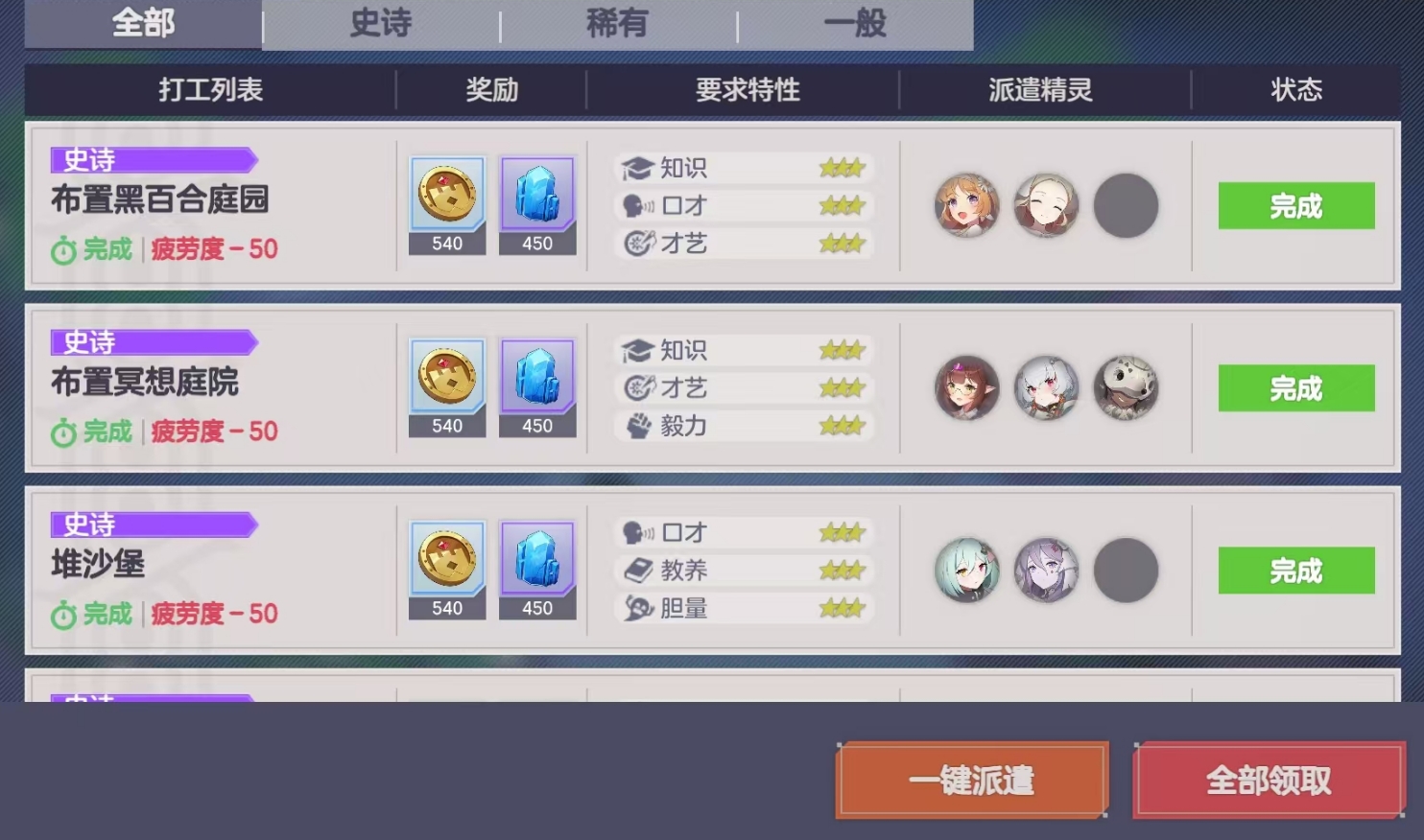 第三项为精灵委派系统,即“打工”机制。玩家可在专属界面指派已解锁的精灵前往执行不同类别的委托任务。任务按稀有度划分为史诗、稀有、一般三档,其中史诗级任务报酬最优,且固定产出扭蛋球、永恒花等高价值物品;而普通任务回报率偏低,不建议优先安排。所有任务均统一消耗1点疲劳值,因此应集中调度精灵参与高回报委托。当精灵疲劳值归零后,可将其移入休息栏自动恢复,恢复满值后自动退出该栏位;已满疲劳的精灵不可再次放入休息栏。