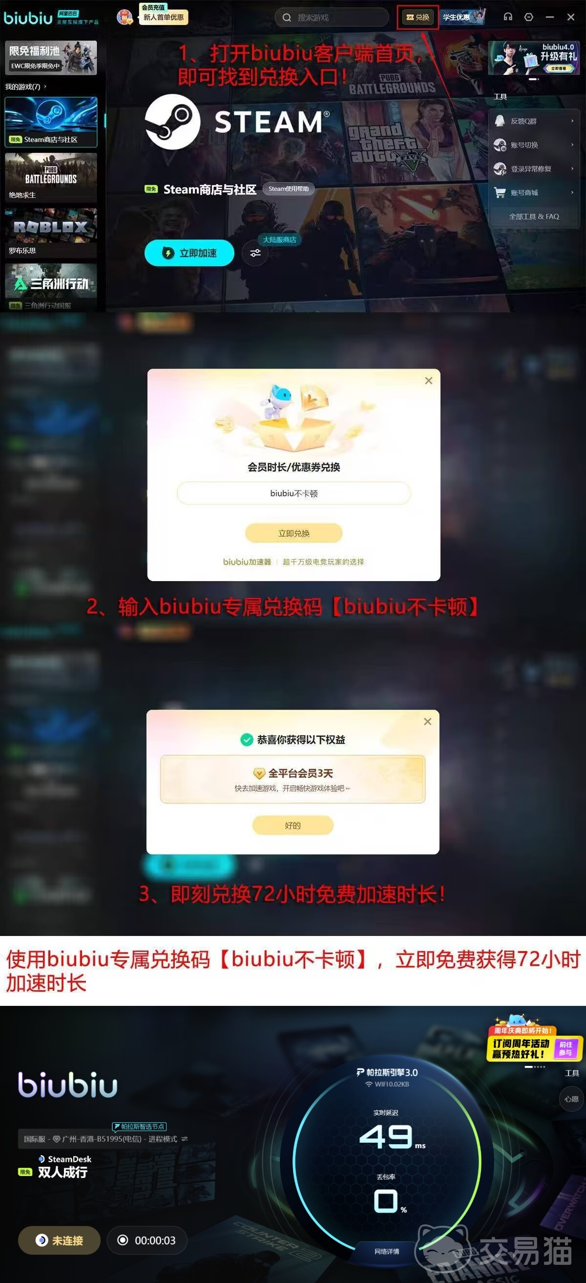 除技术升级外,平台同步推出多项用户权益:新注册用户首次登录即获24小时免费加速时长,无任何绑定条件或消费门槛;输入口令“biubiu不卡顿”,还可额外兑换三天会员权限,覆盖平台全部支持游戏,所有用户均可参与,兑换结果实时可见、数据可查。