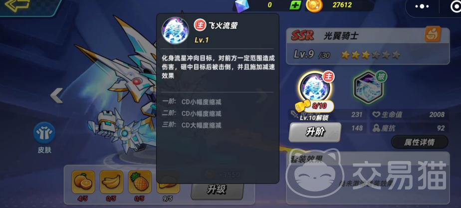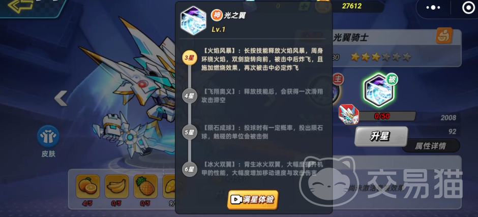 被动技能“光之翼”随星级提升解锁进阶能力:达到3星时激活“火焰风暴”,长按释放环形火焰,对周围敌人造成击退并附加持续燃烧伤害,适用于被围攻时的反打与脱身;升至4星后解锁“飞翔奥义”,可在技能结束后进入滞空滑翔状态,规避地面控制效果,并支持空中连招衔接,显著增强生存容错率与追击灵活性。
