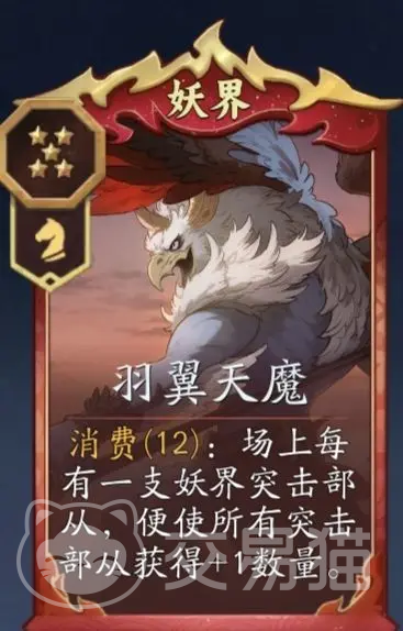 后期成型阶段聚焦于消费体系的深度联动。羽翼天魔为核心枢纽,其技能机制为:场上每存在1名妖界突击部从,所有突击部从数量+1。该效果直接放大骑兵单位规模,显著加速妖气产出与经济滚雪球效应。