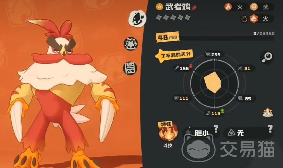 武者鸡定位为高爆发物理输出型火系宠物,核心输出技能为炎爆拳(火系,威力85)与折翼拳(武系,威力95)。二者属性互补,可灵活应对不同抗性阵容。推荐技能组合为:炎爆拳、折翼拳、强健体魄、火焰冲锋。其中强健体魄用于提升物攻与物防,火焰冲锋提供先制+1效果,增强起手压制力。