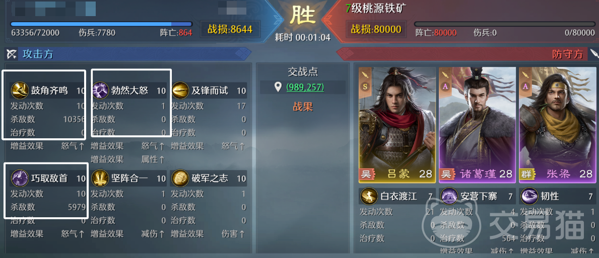 该阵容输出高度集中于孙权主将技,因此在野战环境中表现优异,但面对集结类高韧性阵容时,存在爆发窗口受限、持续压制力不足的问题。备选战法方面,【勃然大怒】适用于需要前置增益的对抗场景,其效果为开战前18秒内提升全队武力与智力,并每秒恢复3点怒气;【巧取敌首】则偏向单体爆发,附带10点怒气返还,可用于补足特定目标斩杀线。