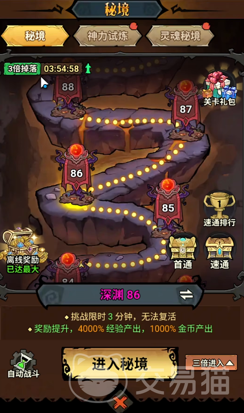 秘境系统为关键养成渠道。除固定奖励外,其特有的三倍掉落机制与离线收益叠加规则,使持续挑战成为性价比最高的资源获取方式。关卡推进深度直接关联离线挂机产出量,建议依据当前战力稳步突破,避免卡关导致资源断档。