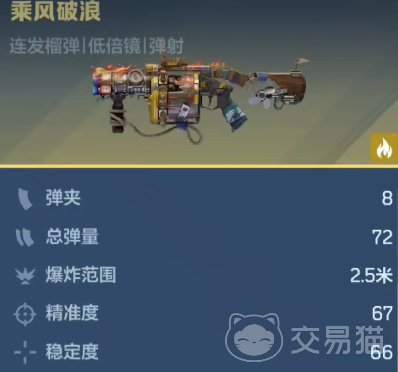 “乘风破浪”定位为高机动性连发榴弹枪,在当前版本中属于战术价值突出的重型火力单位。其核心优势在于大范围群体压制能力——单发爆炸半径达2.5米,配合67的精准度与66的稳定度,可在中近距离实现高效清场,尤其适用于生化模式下应对密集敌群。