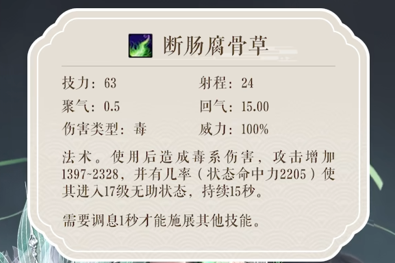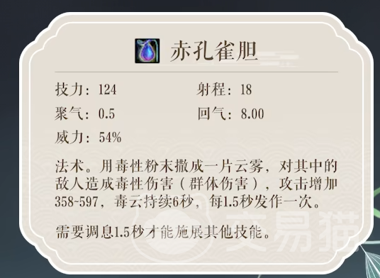 其核心战斗逻辑围绕“五毒心”状态展开——该状态可显著强化毒属性伤害,但同步削弱治疗效能,从而强制职业向纯输出方向倾斜。关键主动技能“葬花”具备强控能力,命中后触发眩晕,为后续连招创造安全窗口;配合“赤孔雀胆”扩大毒云覆盖范围,并衔接“断肠复古草”完成多段持续掉血,形成“控—扩—续”的标准输出链。此组合兼顾节奏掌控与伤害密度,是副本与团战中的主流起手范式。