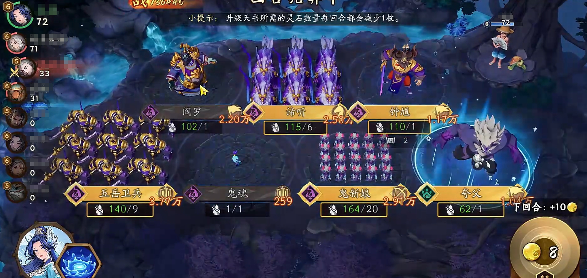 地府爆兵流以“小鬼转化阎罗”为核心运转轴心。需先将天书升至五级,随后锁定忘忧、黑无常与白无常。通过上阵一级部从并主动摧毁,持续生成小鬼;集满100只后自动合成阎罗,此后每回合稳定产出小鬼,形成不可逆的兵力膨胀,最终达成全场压制级场面,强度天花板突出。